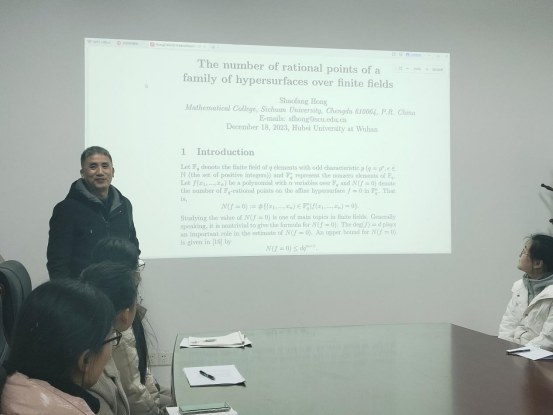 2023年12月18日上午,四川大学洪绍方教授应邀为365师生作了题为《The number of rational points of a family of hypersurfaces over finite fields》的学术报告。