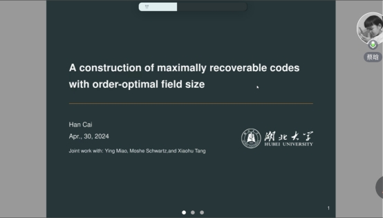 2024年4月30日下午,西南交通大学蔡晗教授为365师生作了题为《A construction of maximally recoverable codes with order-optimal field size》的线上学术报告。
