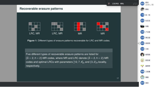 随后,蔡晗教授介绍了他们关于极大可修复码的重要研究成果,基于线性化RS码构造出一大类极大可修复码的无限类,其相比于已知构造结果具有更小的基域大小,并针对某些情形所构造码的基域大小达到order-optimal。与会师生深受启发,并与蔡晗教授就相关问题展开热烈讨论。