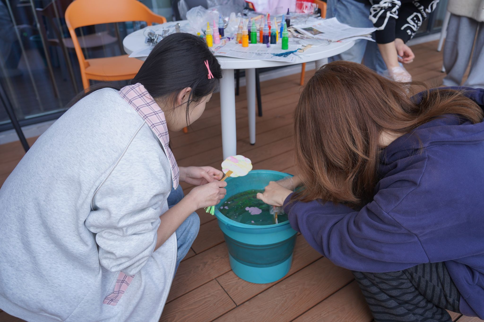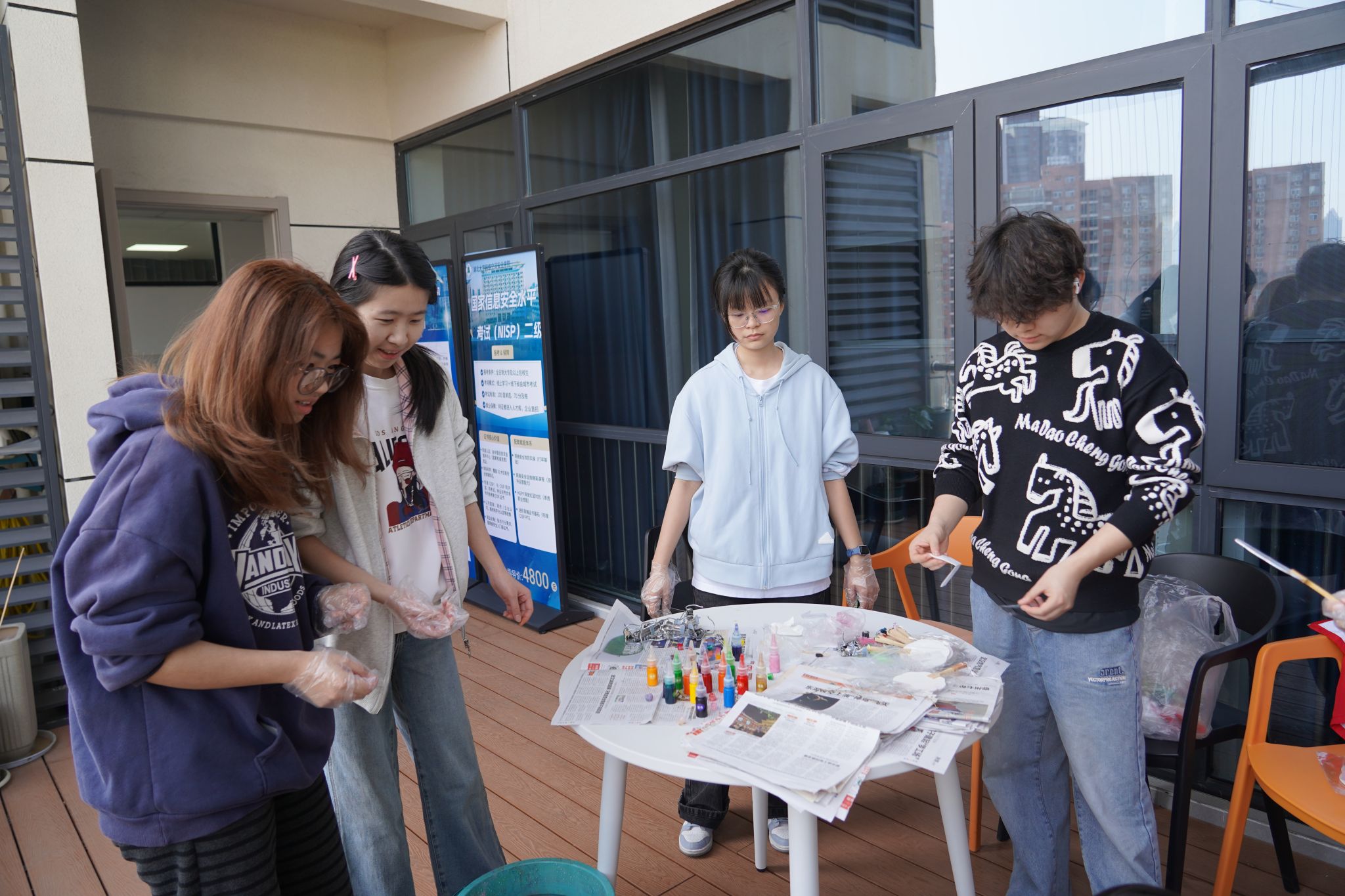 活动现场,学院精心布置的阳台焕然一新。新栽种的绣球花与郁金香竞相绽放,粉紫相间、春意盎然。同学们围坐在花丛间的桌椅旁,在轻松愉悦的氛围中开始了漆扇创作。大家手持素白扇面,蘸取各色颜料,或描绘心中美景,或书写青春寄语,将所思所感倾注于笔端。活动现场欢声笑语不断,同学们在艺术创作中放松身心,在交流互动中增进情谊。