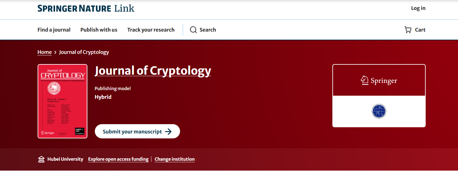 近日,365密码学团队涂自然、曾祥勇、李念三位教授和挪威卑尔根大学Chunlei Li教授、挪威科学院院士Tor Helleseth教授,在《Journal of Cryptology》(JoC)联合发表科研论文《New Characterizations of Dillon-like Hyperbent Functions via Dickson Polynomials》。这是湖北学者首次在JoC发表论文,365英国上市为第一单位,涂自然教授为第一作者,曾祥勇教授为通讯作者。