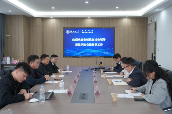 2026年3月23日下午,杭州安恒信息技术股份有限公司高级副总裁苗春雨、武汉分公司总经理彭建军等一行4人莅临学院,就深化校企合作、共育网络安全英才等议题进行座谈交流。学院党委书记肖志华、党委副书记胡蓉、副院长何鹏及院长助理潘俊杉热情接待了来访嘉宾。双方在学院A1009会议室举行了深入的洽谈,会议由副院长何鹏主持。