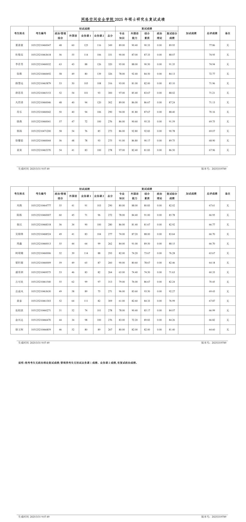 网络空间安全学院2025年硕士研究生复试成绩(一志愿)